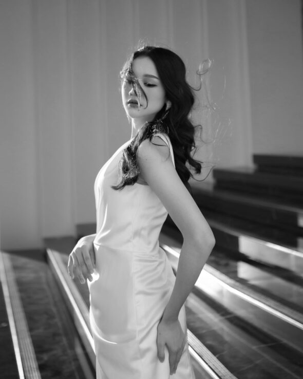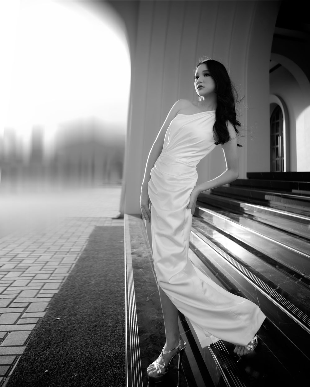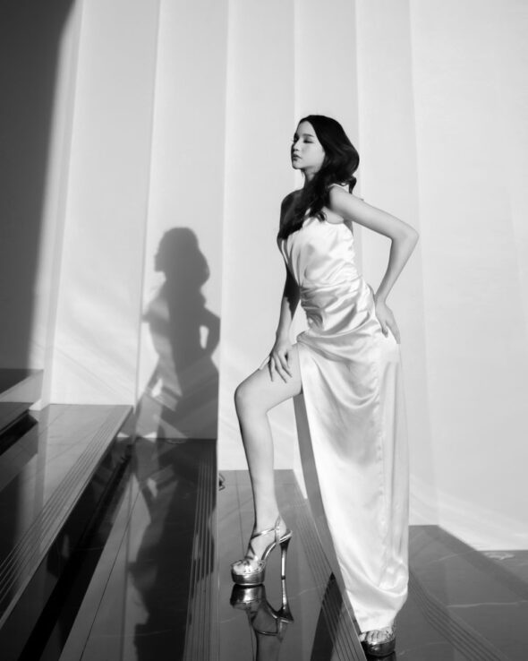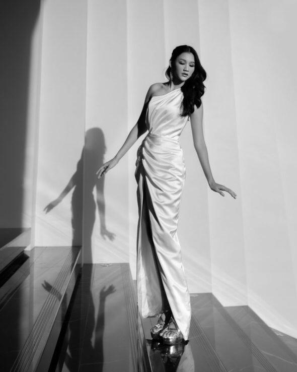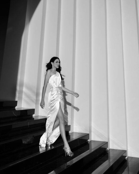 Concept: A high-fashion editorial blending dynamic couture design with the grand architecture of Bumi Permasih. The series moves between the explosive motion of fabric under atrium light and an intimate monochrome study of form, stark light, and shadow.