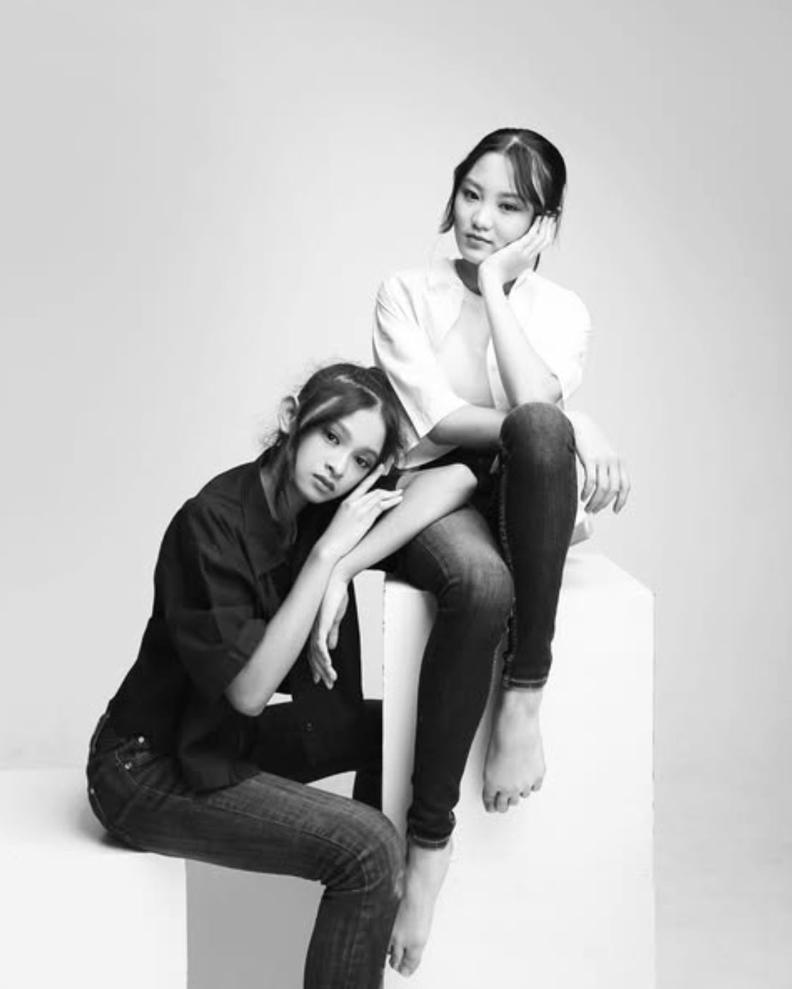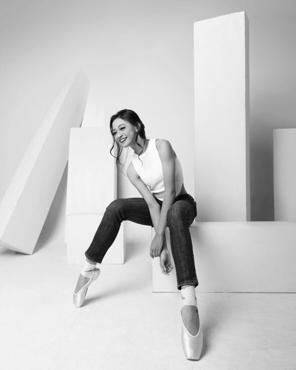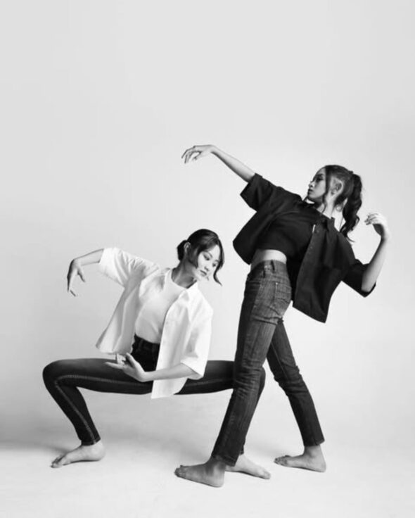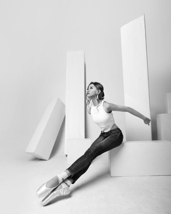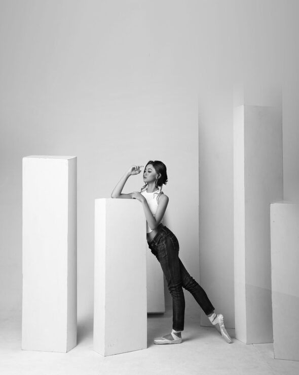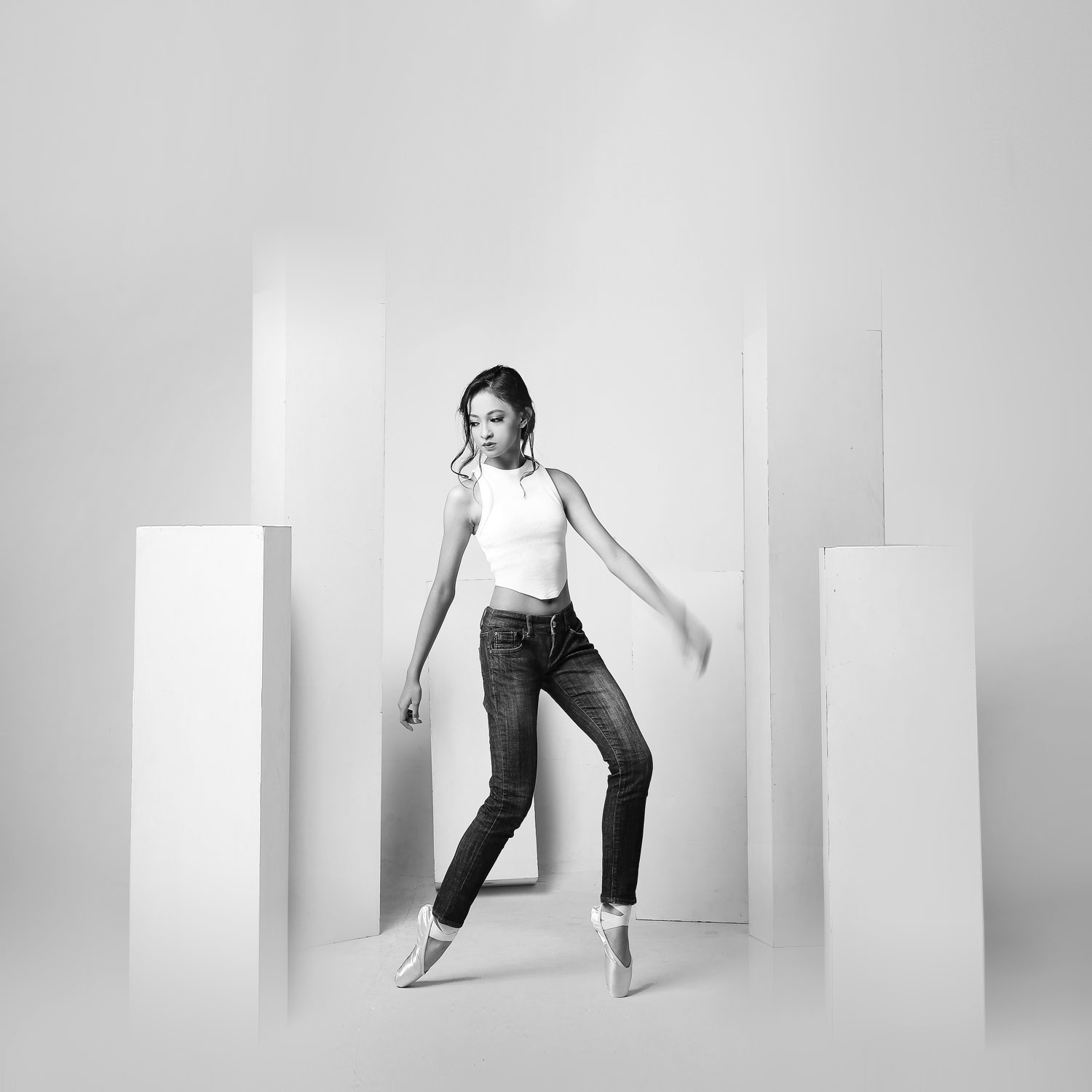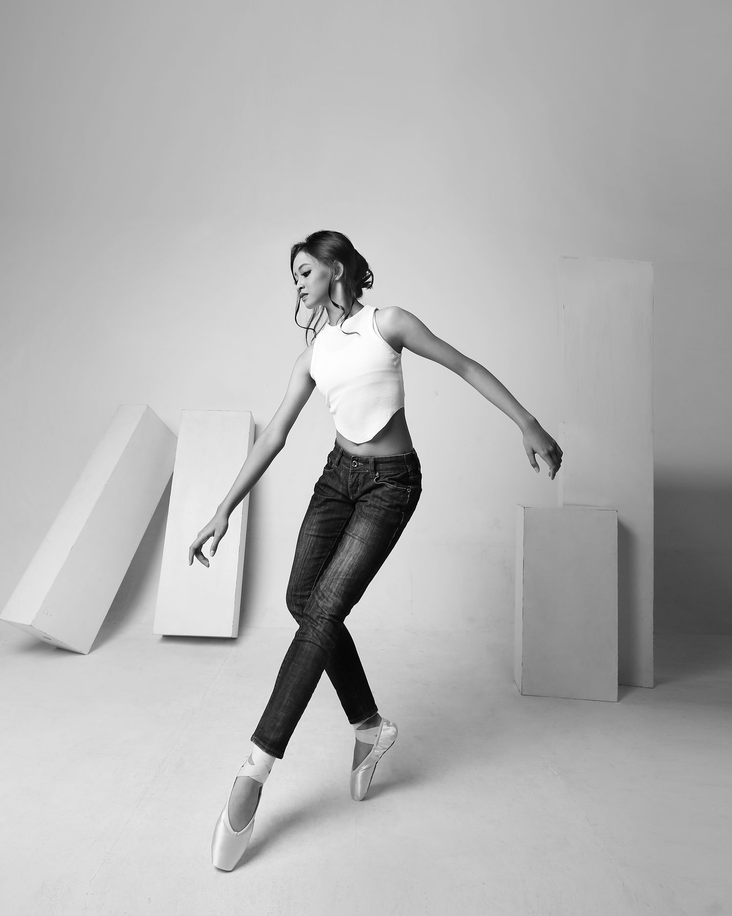 Concept: A conceptual photoshoot for a fashion editorial. This series is a study in dichotomy: marrying the fluid lines of ballet with the stark structure of jeans and pointe shoes. The minimalist geometric set highlights the strength and poise of the dancers in their modern ballet “uniform.”