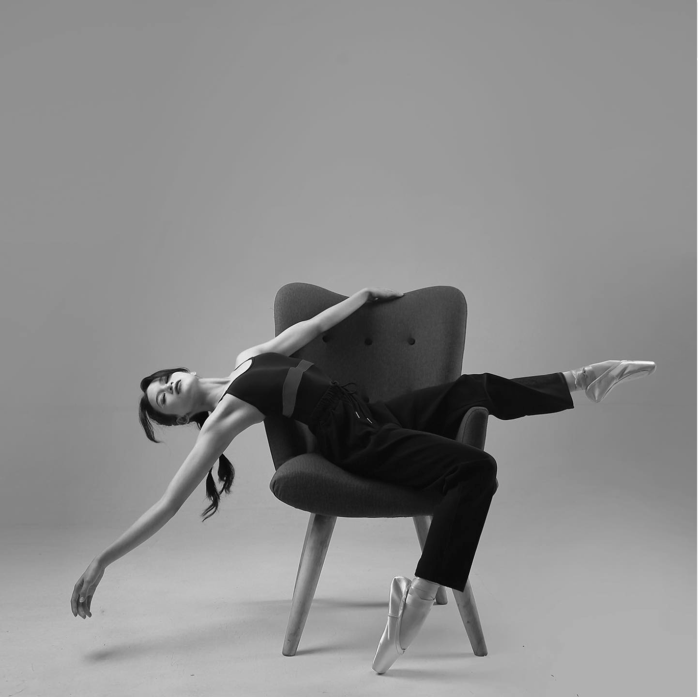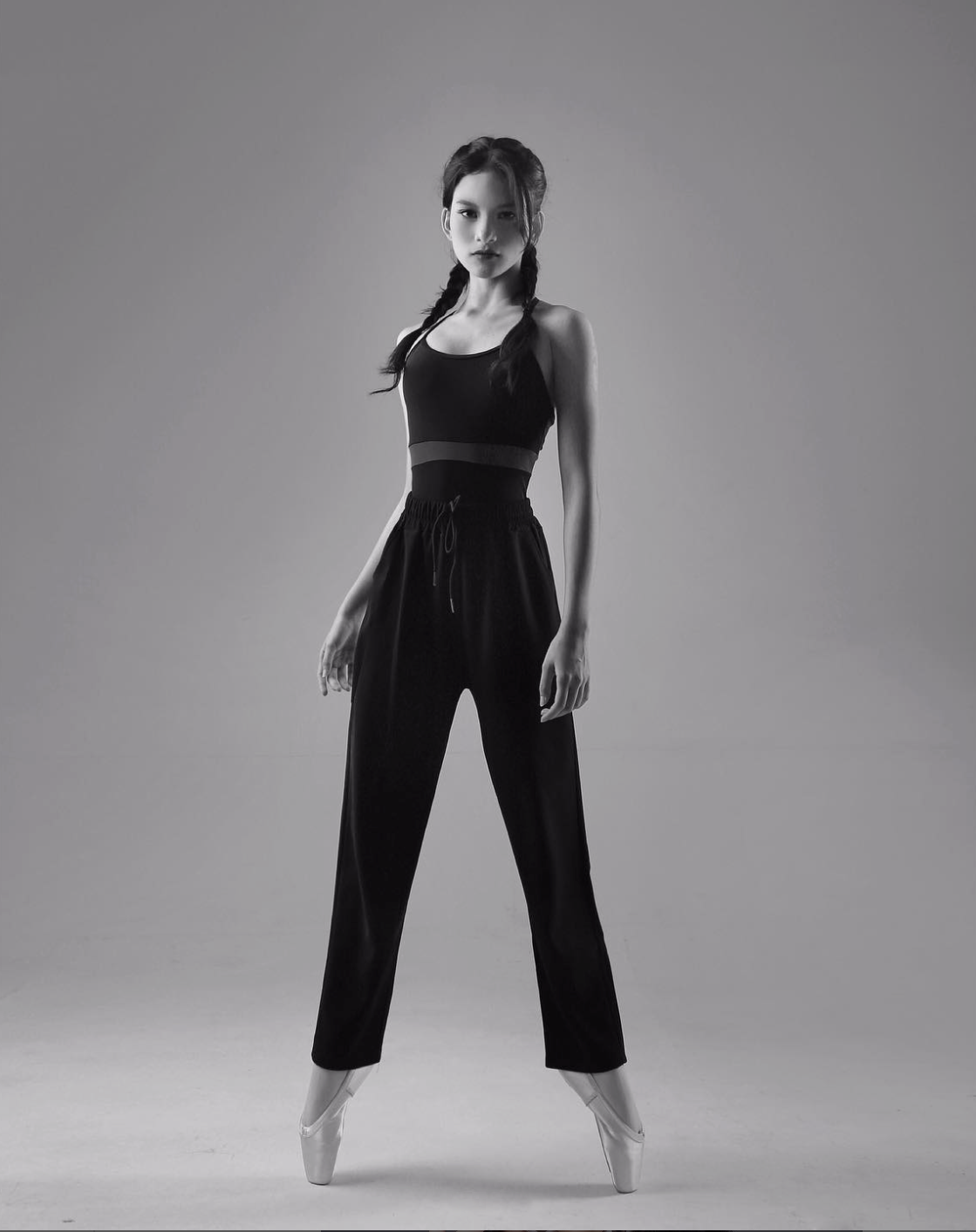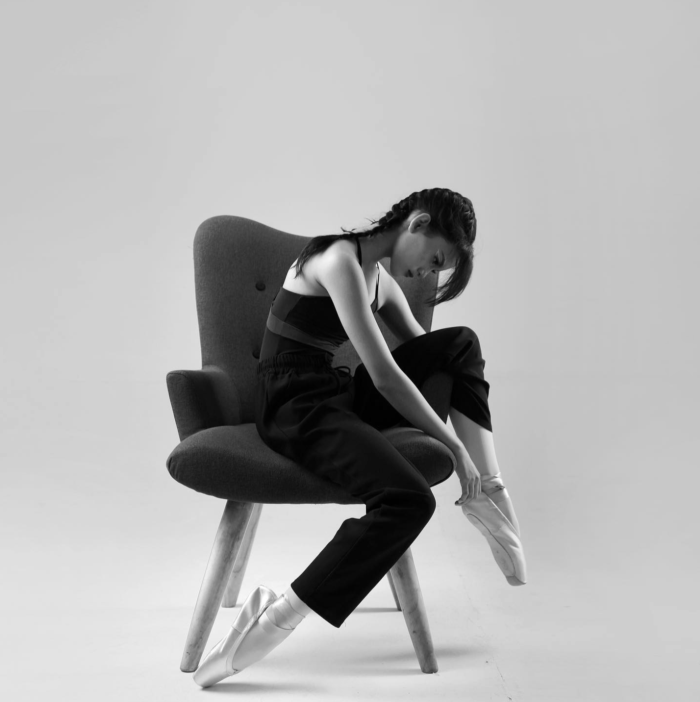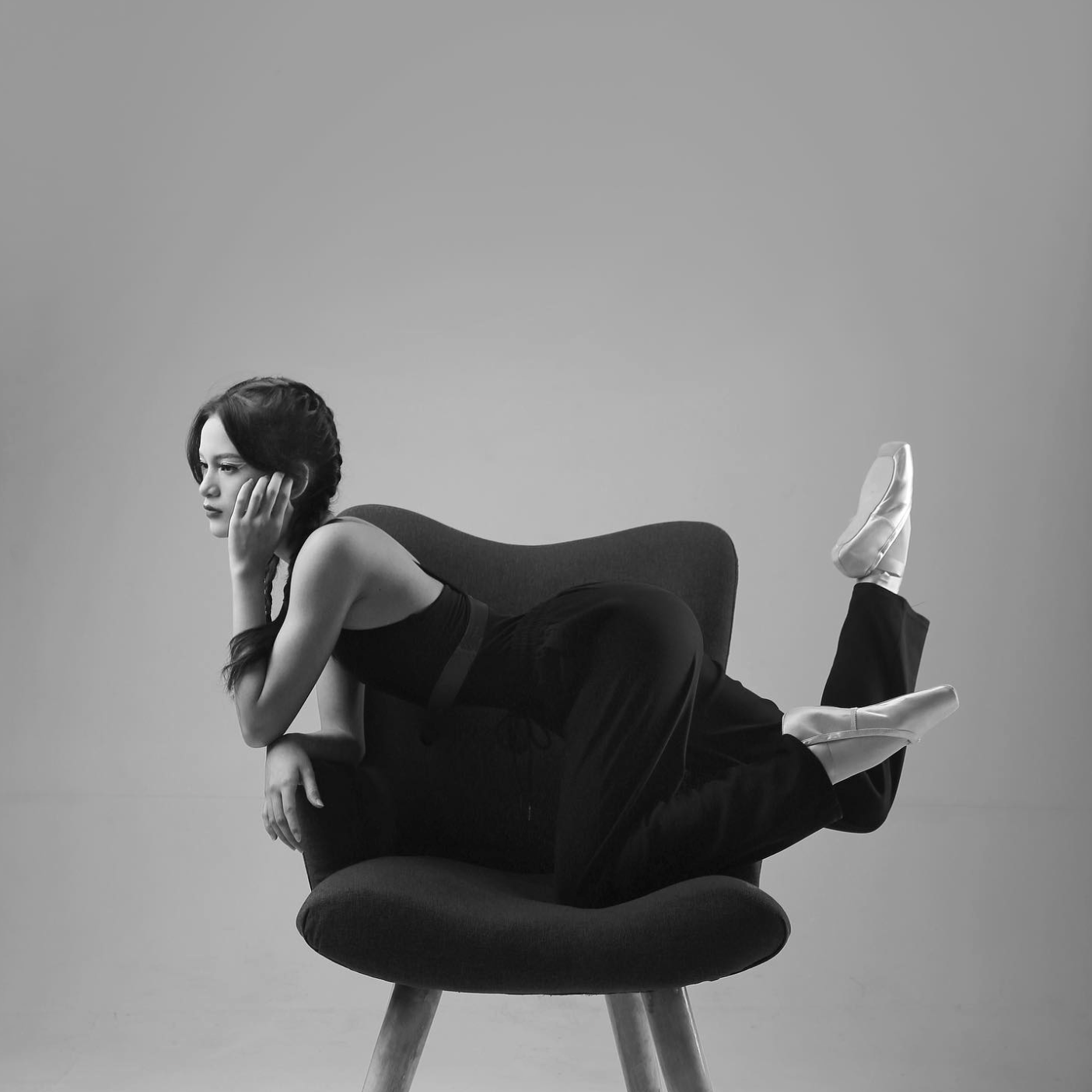 Concept: A minimalist studio portrait session shot during recital days. This black-and-white series aims to visualize Hanun’s raw talent with a modern approach: combining classical ballet technique with casual styling and simple props to highlight character and strong body lines.